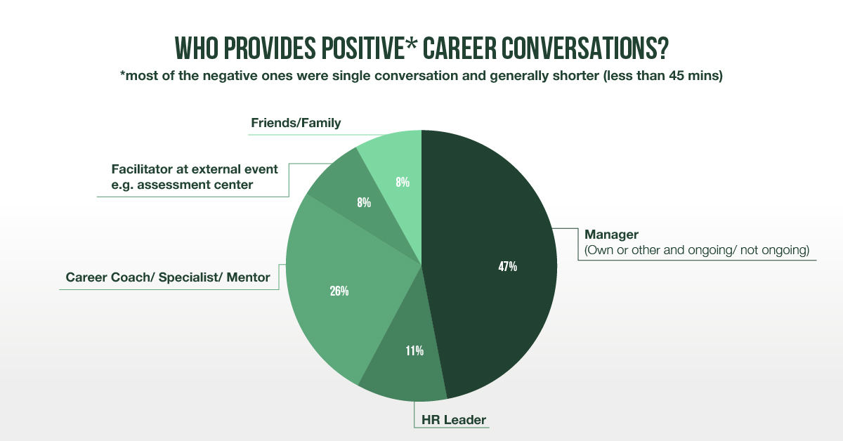 Research[3] suggests that more than half (c.58%) of the positive Career Conversations happen within the workplace – with a manager (either their own or another) or the HR team. The remainder happen with an external specialist (e.g. a certified career coach or mentor) or a friend/work colleague.
