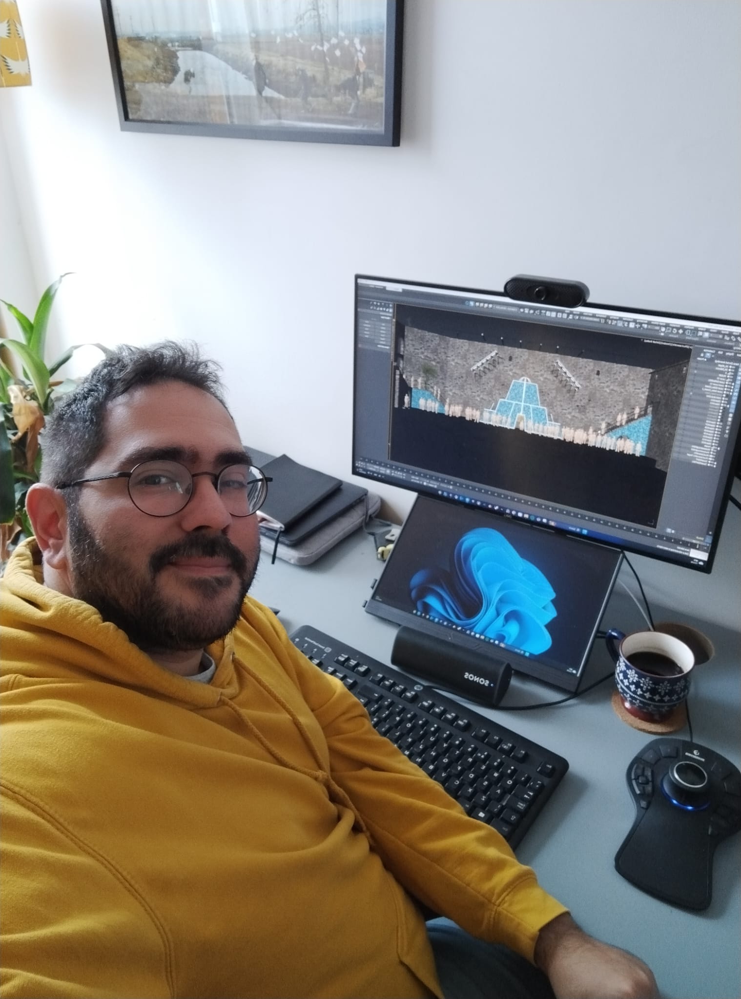 Yorgos Kefalas is 36 and was born and grew up in Greece. Yorgos moved to the UK in 2016, and he now lives in London with his boyfriend, Daniel. Yorgos currently works as a freelance 3D Designer. He has obtained several degrees in related areas such as Graphic Design, Audio Visual Arts, Sound Design, and Sound and Music Computing. He has worked on stage shows such as HMS Pinafore, Moulin Rouge and Wicked. Yorgos appreciates having “the ability to choose” what projects he now works on. By learning many related areas in the world of theatre, he is able to “jump from project to project” and also enjoy the process.
