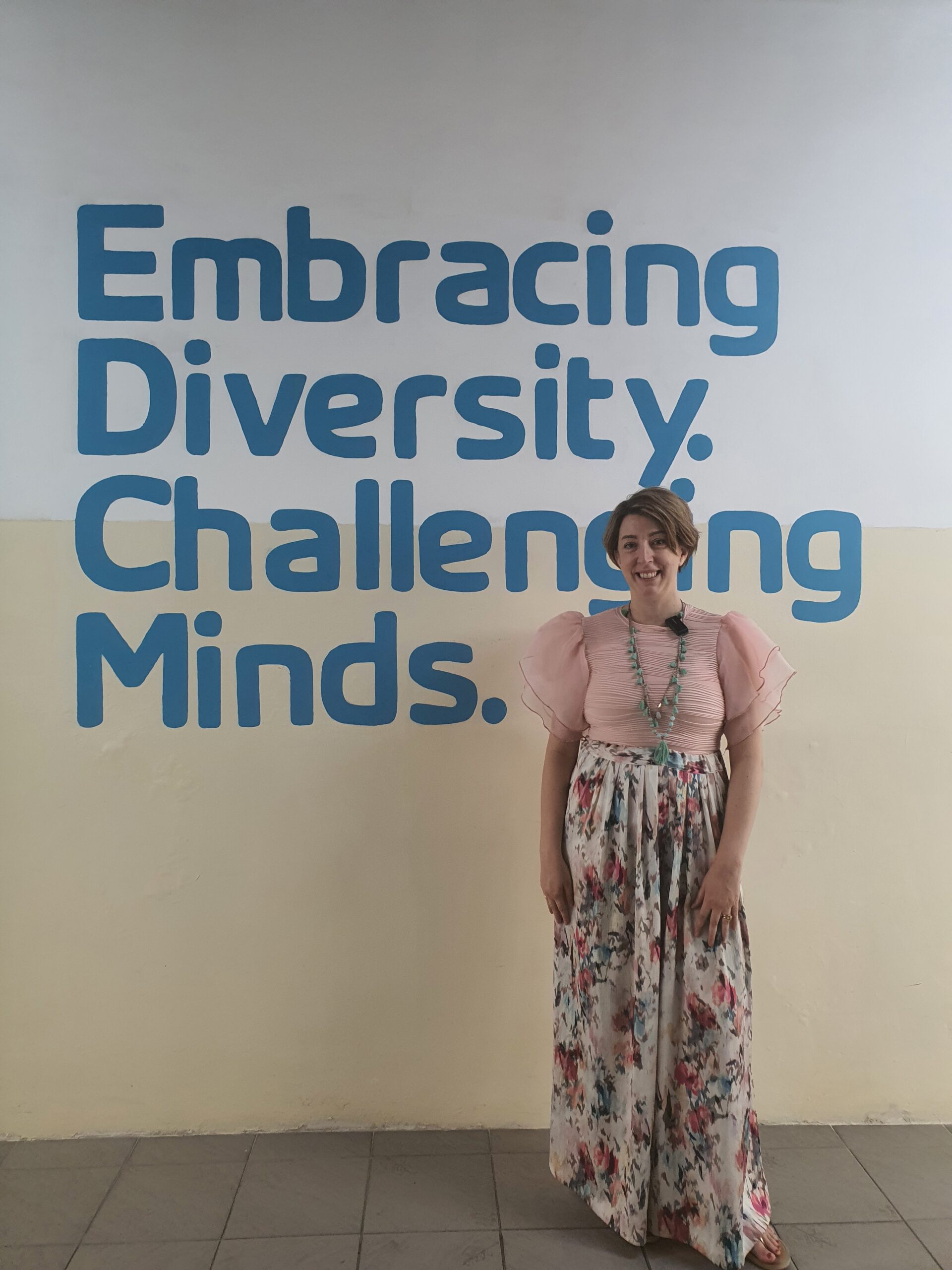 Ruth at Nexus School, in front of their values